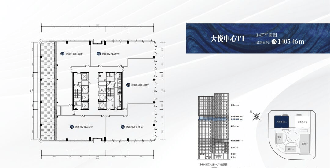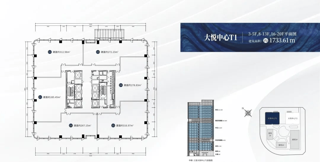 大悦中心——T3(100米写字楼)共21层,总建面约2.4万㎡,约12米建筑层高大堂,标准层高约4.2米,标准层(13-21F)建面约为1525.47㎡,分户建面约284-333㎡。