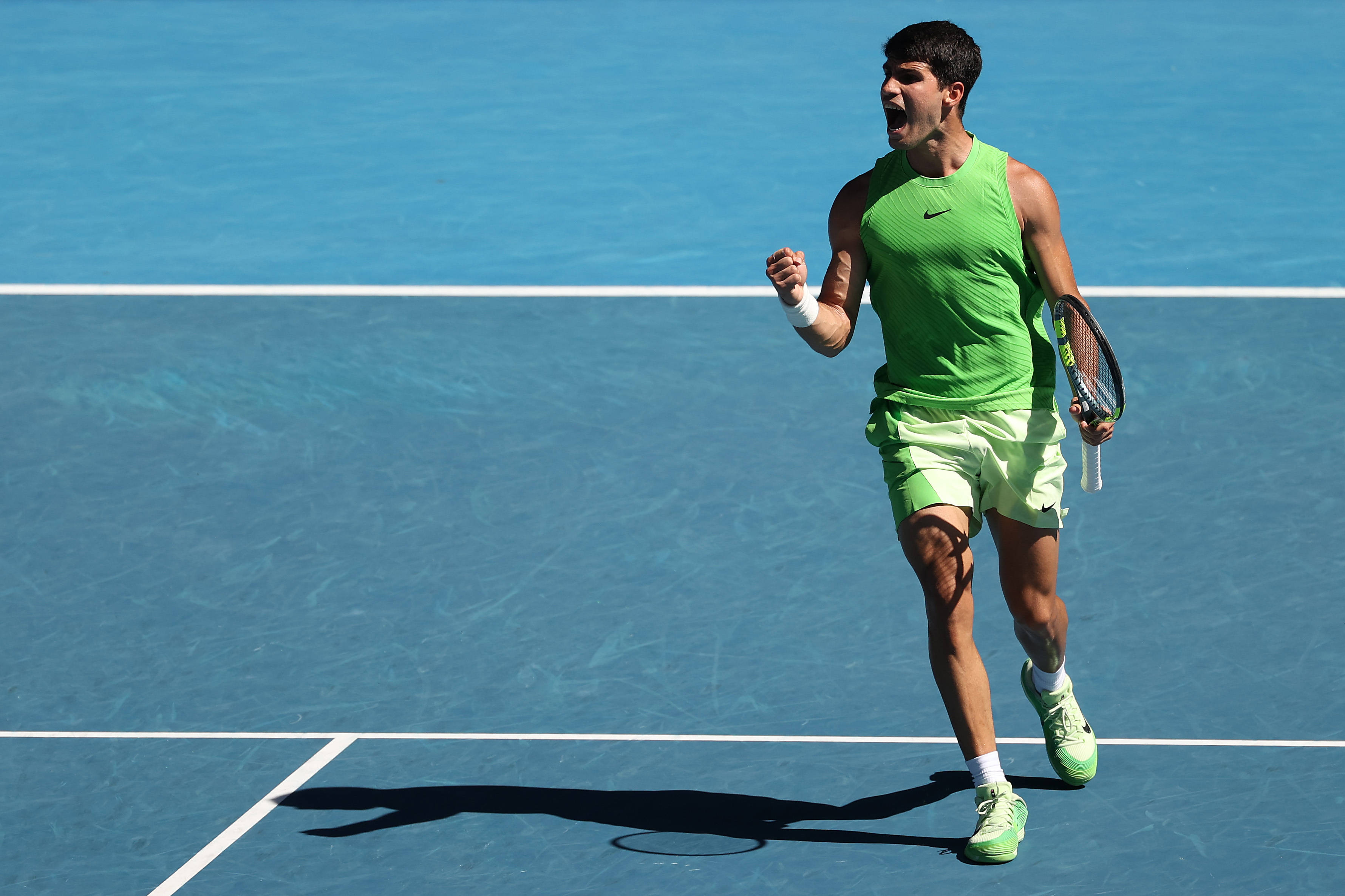 这场比赛耗时5小时27分钟,被认为是一场足以载入澳网史册的史诗级比赛之一。不过,这场比赛也出现了一个巨大的争议,在第三盘盘末阶段,阿尔卡拉斯右大腿出现不适,申请医疗暂停。